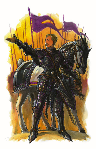 The famous Purple Dragons of Cormyr are regarded across Faerun as exemplars of disciplined, skilled, loyal soldiers. Their reputation is deserved partly because of the heroic actions of their leaders, the Purple Dragon Knights. Purple Dragon Knights develop uncanny skills relating to coordinating and leading soldiers. Most are fighters, rangers or paladins, but a few bards, clerics, and rogues have been known to become Purple Dragon Knights. Sorcerers and Wizards tend to join the War Wizards, Cormyr's elite brigade of fighting spellcasters, while barbarians are too undisciplined, and druids and monks too “uncivilized” in Cormyr to enter this career.